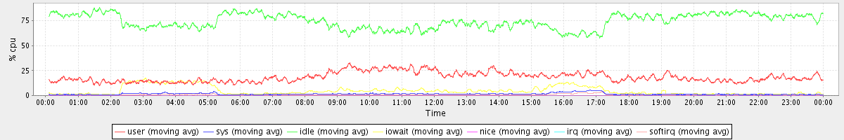 avg(user) = 18.43 avg(sys) = 1.57 avg(idle) = 74.52 avg(iowait) = 4.74 avg(nice) = 0.00 avg(irq) = 0.05 avg(softirq) = 0.69