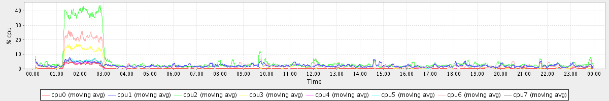 avg(cpu0) = 0.50 avg(cpu1) = 2.29 avg(cpu2) = 5.25 avg(cpu3) = 1.19 avg(cpu4) = 0.36 avg(cpu5) = 0.48 avg(cpu6) = 3.23 avg(cpu7) = 0.48
