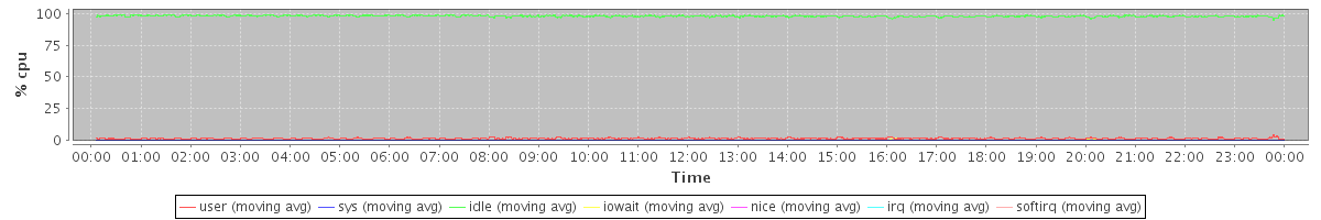 avg(user) = 1.65 avg(sys) = 0.26 avg(idle) = 97.90 avg(iowait) = 0.20 avg(nice) = 0.00 avg(irq) = 0.00 avg(softirq) = 0.00