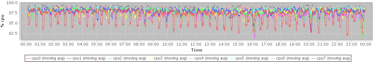 avg(cpu0) = 96.83 avg(cpu1) = 97.86 avg(cpu2) = 97.88 avg(cpu3) = 97.87 avg(cpu4) = 97.60 avg(cpu5) = 98.26 avg(cpu6) = 98.41 avg(cpu7) = 98.51