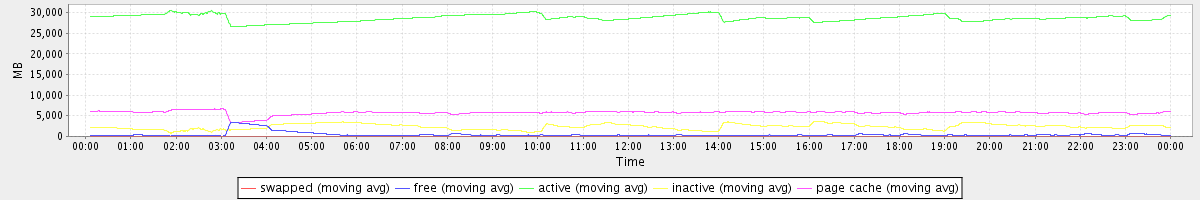 avg(swapped) = 0.25 avg(free) = 434.56 avg(active) = 28726.12 avg(inactive) = 2345.80 avg(page cache) = 5757.45