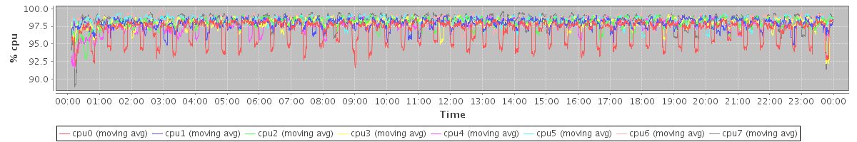 avg(cpu0) = 96.94 avg(cpu1) = 97.88 avg(cpu2) = 98.00 avg(cpu3) = 97.99 avg(cpu4) = 97.75 avg(cpu5) = 98.29 avg(cpu6) = 98.38 avg(cpu7) = 98.37