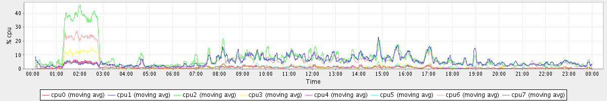 avg(cpu0) = 1.39 avg(cpu1) = 0.26 avg(cpu2) = 0.29 avg(cpu3) = 0.22 avg(cpu4) = 0.24 avg(cpu5) = 0.20 avg(cpu6) = 0.25 avg(cpu7) = 0.19