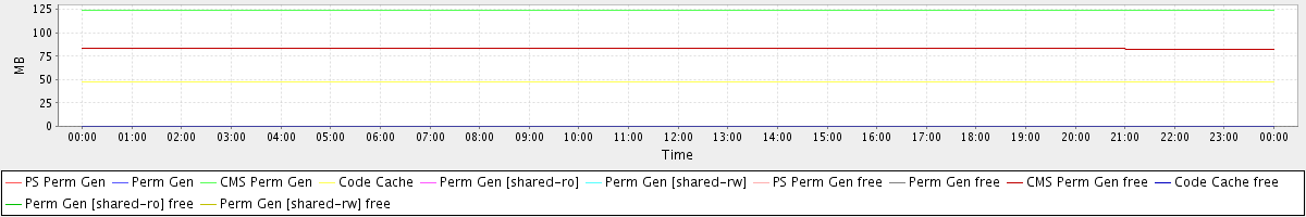 avg(PS Perm Gen) = 0.00 avg(Perm Gen) = 0.00 avg(CMS Perm Gen) = 124.13 avg(Code Cache) = 47.57 avg(Perm Gen [shared-ro]) = 0.00 avg(Perm Gen [shared-rw]) = 0.00 avg(PS Perm Gen free) = 0.00 avg(Perm Gen free) = 0.00 avg(CMS Perm Gen free) = 83.10 avg(Code Cache free) = 0.37 avg(Perm Gen [shared-ro] free) = 0.00 avg(Perm Gen [shared-rw] free) = 0.00