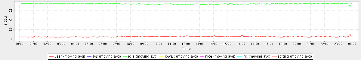 avg(user) = 6.41 avg(sys) = 0.65 avg(idle) = 92.82 avg(iowait) = 0.02 avg(nice) = 0.00 avg(irq) = 0.00 avg(softirq) = 0.08
