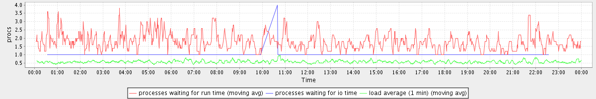 avg(processes waiting for run time) = 0.69 avg(processes waiting for io time) = 0.01 avg(load average (1 min)) = 0.58