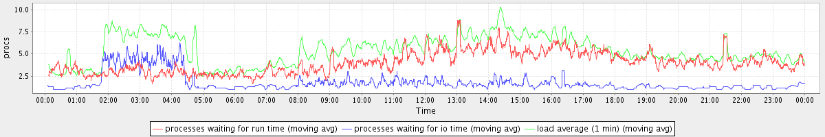 avg(processes waiting for run time) = 4.04 avg(processes waiting for io time) = 1.11 avg(load average (1 min)) = 5.41