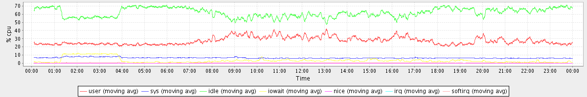 avg(user) = 27.48 avg(sys) = 6.58 avg(idle) = 62.14 avg(iowait) = 3.37 avg(nice) = 0.00 avg(irq) = 0.03 avg(softirq) = 0.39