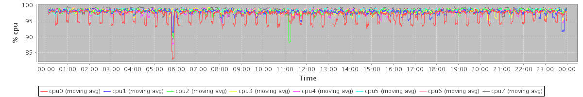 avg(cpu0) = 96.82 avg(cpu1) = 97.82 avg(cpu2) = 98.02 avg(cpu3) = 97.98 avg(cpu4) = 97.86 avg(cpu5) = 98.30 avg(cpu6) = 98.37 avg(cpu7) = 98.58