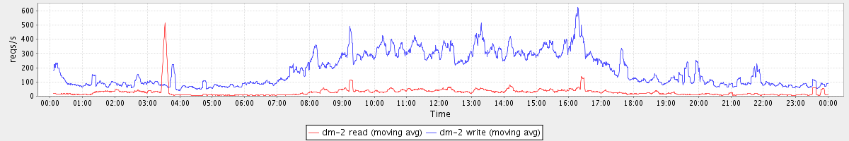 avg(dm-2 read) = 432.58 avg(dm-2 write) = 1098.45