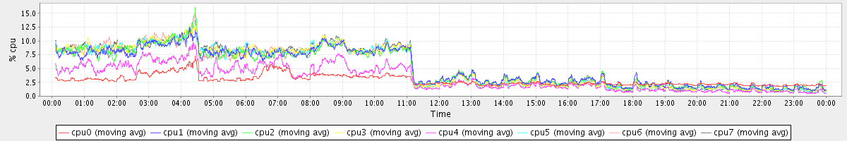 avg(cpu0) = 2.87 avg(cpu1) = 5.15 avg(cpu2) = 5.12 avg(cpu3) = 5.15 avg(cpu4) = 3.28 avg(cpu5) = 5.10 avg(cpu6) = 5.13 avg(cpu7) = 5.13