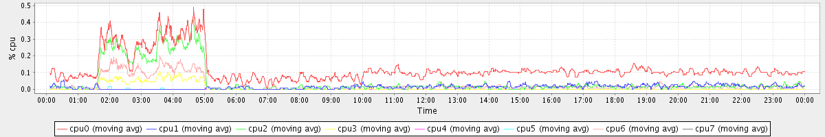 avg(cpu0) = 0.12 avg(cpu1) = 0.01 avg(cpu2) = 0.05 avg(cpu3) = 0.01 avg(cpu4) = 0.00 avg(cpu5) = 0.00 avg(cpu6) = 0.02 avg(cpu7) = 0.00