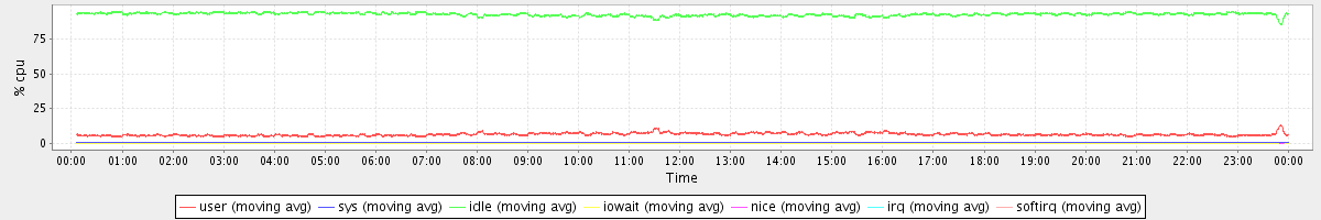 avg(user) = 6.48 avg(sys) = 0.65 avg(idle) = 92.76 avg(iowait) = 0.03 avg(nice) = 0.00 avg(irq) = 0.00 avg(softirq) = 0.08