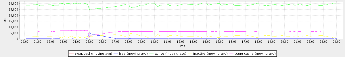 avg(swapped) = 0.25 avg(free) = 358.06 avg(active) = 28798.63 avg(inactive) = 2284.05 avg(page cache) = 6295.71