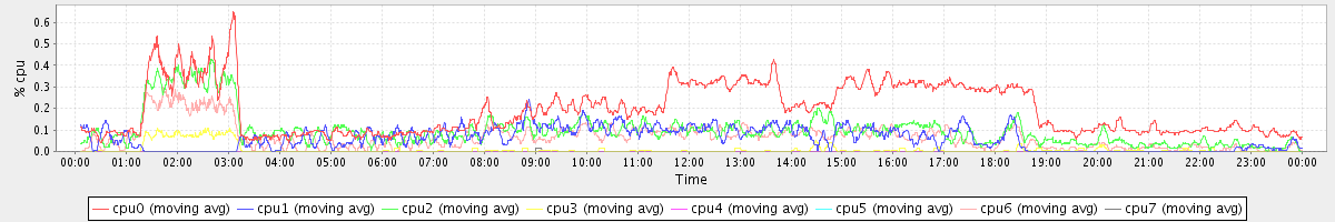 avg(cpu0) = 1.75 avg(cpu1) = 0.37 avg(cpu2) = 0.41 avg(cpu3) = 0.29 avg(cpu4) = 0.30 avg(cpu5) = 0.29 avg(cpu6) = 0.38 avg(cpu7) = 0.27