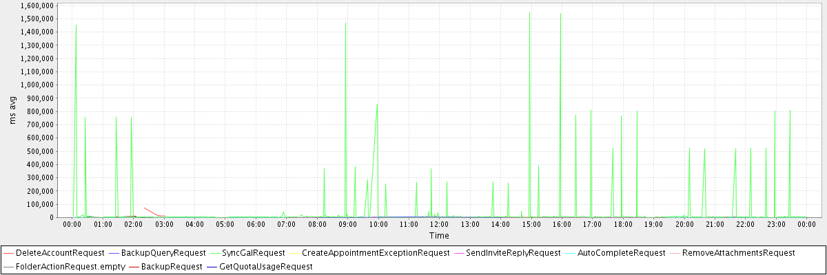 avg(DeleteAccountRequest) = 27638.75 avg(BackupQueryRequest) = 1392.60 avg(SyncGalRequest) = 31125.11 avg(CreateAppointmentExceptionRequest) = 750.33 avg(SendInviteReplyRequest) = 637.10 avg(AutoCompleteRequest) = 679.86 avg(RemoveAttachmentsRequest) = 755.00 avg(FolderActionRequest.empty) = 1290.74 avg(BackupRequest) = 4958.00 avg(GetQuotaUsageRequest) = 971.00
