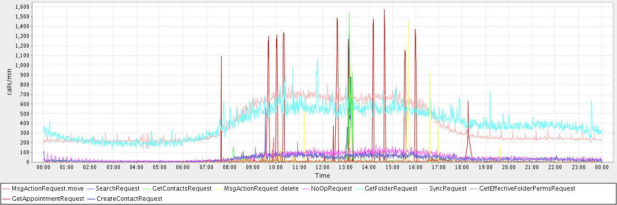 max(MsgActionRequest.move) = 251.00 max(SearchRequest) = 561.00 max(GetContactsRequest) = 1547.00 max(MsgActionRequest.delete) = 1474.00 max(NoOpRequest) = 179.00 max(GetFolderRequest) = 1062.00 max(SyncRequest) = 812.00 max(GetEffectiveFolderPermsRequest) = 206.00 max(GetAppointmentRequest) = 1573.00 max(CreateContactRequest) = 1390.00