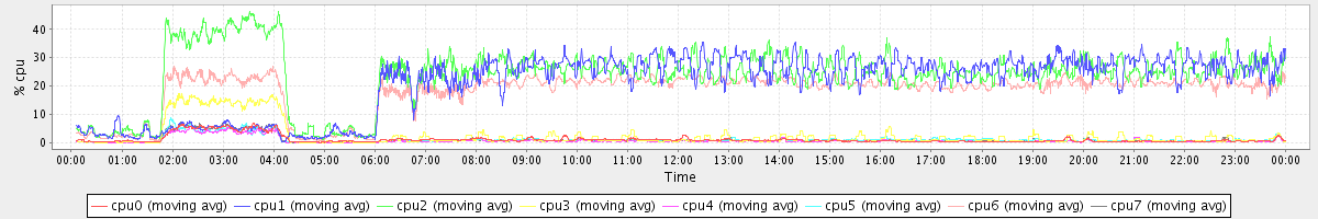 avg(cpu0) = 1.19 avg(cpu1) = 20.88 avg(cpu2) = 24.06 avg(cpu3) = 2.48 avg(cpu4) = 0.83 avg(cpu5) = 1.17 avg(cpu6) = 18.34 avg(cpu7) = 1.15