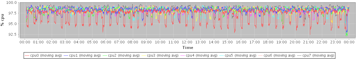 avg(cpu0) = 97.12 avg(cpu1) = 98.20 avg(cpu2) = 98.19 avg(cpu3) = 98.14 avg(cpu4) = 98.07 avg(cpu5) = 98.21 avg(cpu6) = 98.43 avg(cpu7) = 98.63