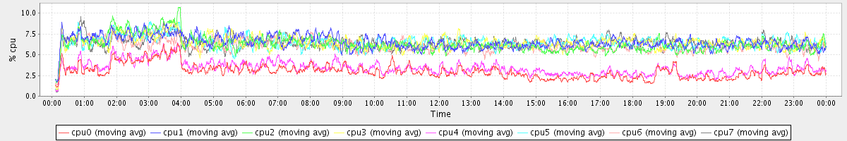avg(cpu0) = 1.18 avg(cpu1) = 0.27 avg(cpu2) = 0.32 avg(cpu3) = 0.20 avg(cpu4) = 0.23 avg(cpu5) = 0.18 avg(cpu6) = 0.26 avg(cpu7) = 0.18