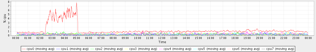 avg(cpu0) = 0.12 avg(cpu1) = 0.02 avg(cpu2) = 0.05 avg(cpu3) = 0.01 avg(cpu4) = 0.00 avg(cpu5) = 0.00 avg(cpu6) = 0.03 avg(cpu7) = 0.00