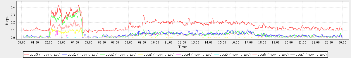 avg(cpu0) = 1.59 avg(cpu1) = 0.23 avg(cpu2) = 0.28 avg(cpu3) = 0.18 avg(cpu4) = 0.19 avg(cpu5) = 0.17 avg(cpu6) = 0.24 avg(cpu7) = 0.16