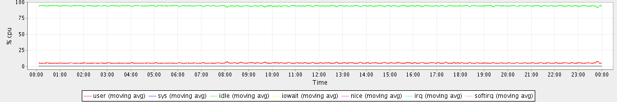 avg(user) = 5.33 avg(sys) = 0.54 avg(idle) = 94.12 avg(iowait) = 0.00 avg(nice) = 0.00 avg(irq) = 0.00 avg(softirq) = 0.00