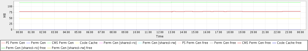 avg(PS Perm Gen) = 0.00 avg(Perm Gen) = 0.00 avg(CMS Perm Gen) = 117.01 avg(Code Cache) = 47.49 avg(Perm Gen [shared-ro]) = 0.00 avg(Perm Gen [shared-rw]) = 0.00 avg(PS Perm Gen free) = 0.00 avg(Perm Gen free) = 0.00 avg(CMS Perm Gen free) = 78.15 avg(Code Cache free) = 0.38 avg(Perm Gen [shared-ro] free) = 0.00 avg(Perm Gen [shared-rw] free) = 0.00