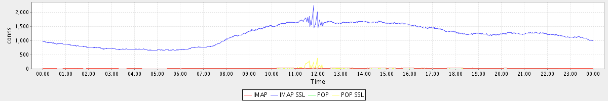avg(IMAP) = 17.93 avg(IMAP SSL) = 1182.22 avg(POP) = 0.07 avg(POP SSL) = 6.60