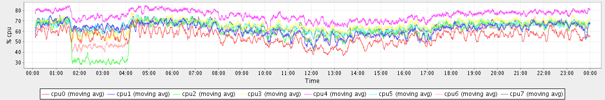 avg(cpu0) = 54.52 avg(cpu1) = 62.09 avg(cpu2) = 59.73 avg(cpu3) = 66.08 avg(cpu4) = 75.34 avg(cpu5) = 65.23 avg(cpu6) = 60.31 avg(cpu7) = 64.94