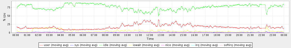 avg(user) = 17.41 avg(sys) = 1.23 avg(idle) = 76.04 avg(iowait) = 4.93 avg(nice) = 0.00 avg(irq) = 0.02 avg(softirq) = 0.36