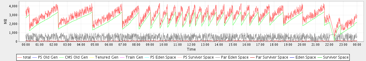 avg(total) = 2922.10 avg(PS Old Gen) = 0.00 avg(CMS Old Gen) = 2368.70 avg(Tenured Gen) = 0.00 avg(Train Gen) = 0.00 avg(PS Eden Space) = 0.00 avg(PS Survivor Space) = 0.00 avg(Par Eden Space) = 481.30 avg(Par Survivor Space) = 72.10 avg(Eden Space) = 0.00 avg(Survivor Space) = 0.00