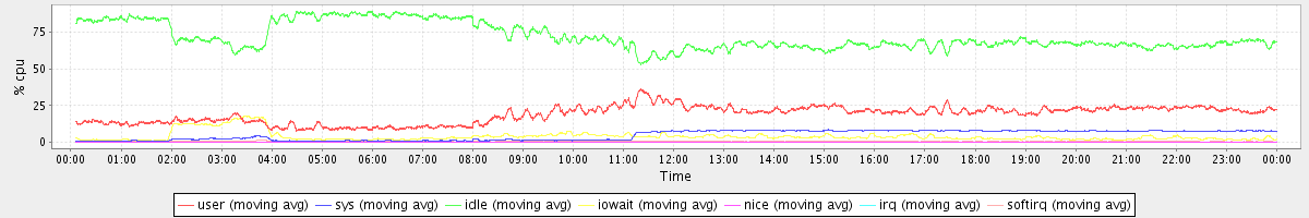 avg(user) = 18.88 avg(sys) = 4.75 avg(idle) = 72.00 avg(iowait) = 3.94 avg(nice) = 0.00 avg(irq) = 0.02 avg(softirq) = 0.40