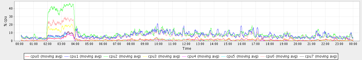 avg(cpu0) = 1.39 avg(cpu1) = 0.30 avg(cpu2) = 0.33 avg(cpu3) = 0.23 avg(cpu4) = 0.23 avg(cpu5) = 0.22 avg(cpu6) = 0.28 avg(cpu7) = 0.20