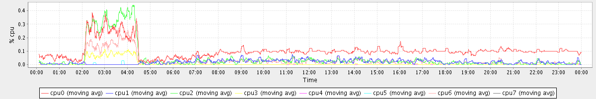 avg(cpu0) = 0.10 avg(cpu1) = 0.02 avg(cpu2) = 0.05 avg(cpu3) = 0.01 avg(cpu4) = 0.00 avg(cpu5) = 0.00 avg(cpu6) = 0.03 avg(cpu7) = 0.00
