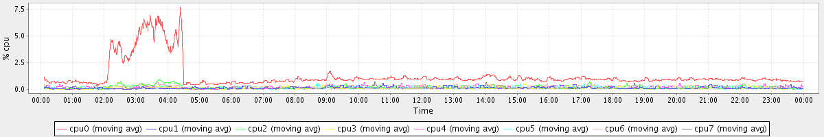 avg(cpu0) = 1.24 avg(cpu1) = 0.13 avg(cpu2) = 0.18 avg(cpu3) = 0.11 avg(cpu4) = 0.13 avg(cpu5) = 0.11 avg(cpu6) = 0.17 avg(cpu7) = 0.10