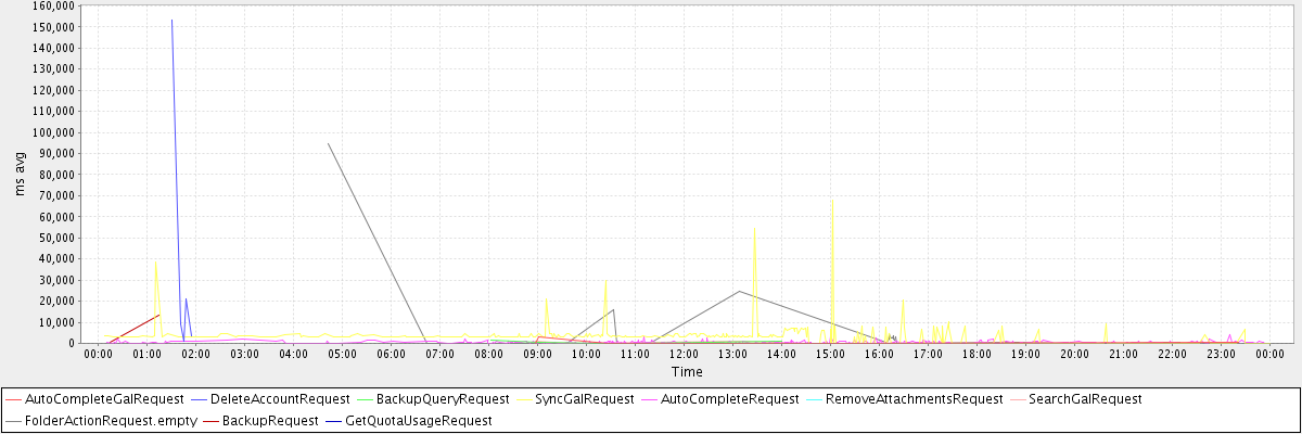 avg(AutoCompleteGalRequest) = 666.33 avg(DeleteAccountRequest) = 37515.20 avg(BackupQueryRequest) = 561.40 avg(SyncGalRequest) = 2957.50 avg(AutoCompleteRequest) = 457.82 avg(RemoveAttachmentsRequest) = 1863.00 avg(SearchGalRequest) = 538.60 avg(FolderActionRequest.empty) = 6055.07 avg(BackupRequest) = 7132.00 avg(GetQuotaUsageRequest) = 927.00