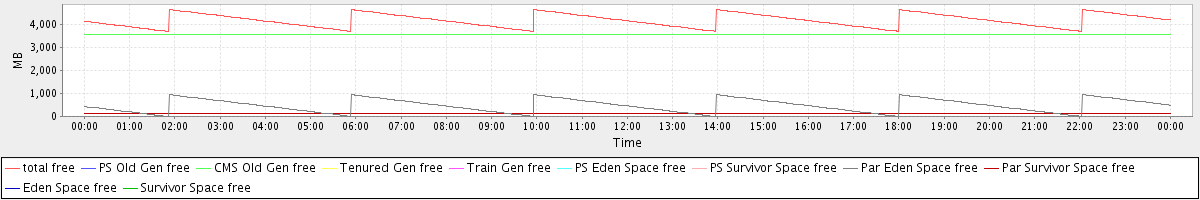 avg(total free) = 4187.77 avg(PS Old Gen free) = 0.00 avg(CMS Old Gen free) = 3594.70 avg(Tenured Gen free) = 0.00 avg(Train Gen free) = 0.00 avg(PS Eden Space free) = 0.00 avg(PS Survivor Space free) = 0.00 avg(Par Eden Space free) = 476.00 avg(Par Survivor Space free) = 117.07 avg(Eden Space free) = 0.00 avg(Survivor Space free) = 0.00