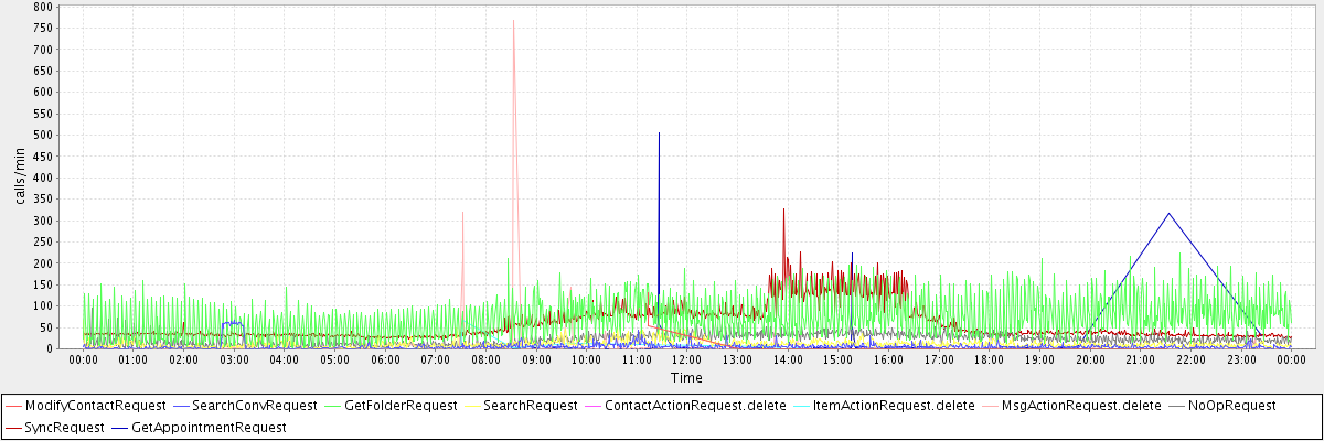 max(ModifyContactRequest) = 131.00 max(SearchConvRequest) = 66.00 max(GetFolderRequest) = 223.00 max(SearchRequest) = 67.00 max(ContactActionRequest.delete) = 136.00 max(ItemActionRequest.delete) = 68.00 max(MsgActionRequest.delete) = 767.00 max(NoOpRequest) = 95.00 max(SyncRequest) = 328.00 max(GetAppointmentRequest) = 506.00