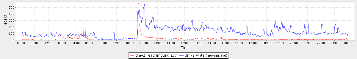 avg(dm-2 read) = 21.45 avg(dm-2 write) = 125.45