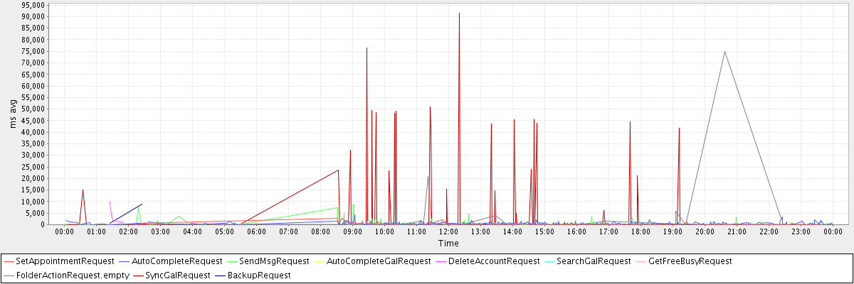 avg(SetAppointmentRequest) = 380.91 avg(AutoCompleteRequest) = 433.01 avg(SendMsgRequest) = 314.86 avg(AutoCompleteGalRequest) = 273.33 avg(DeleteAccountRequest) = 4225.25 avg(SearchGalRequest) = 286.50 avg(GetFreeBusyRequest) = 277.17 avg(FolderActionRequest.empty) = 4747.08 avg(SyncGalRequest) = 1910.57 avg(BackupRequest) = 4845.00