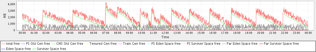 avg(total free) = 1956.84 avg(PS Old Gen free) = 0.00 avg(CMS Old Gen free) = 1436.85 avg(Tenured Gen free) = 0.00 avg(Train Gen free) = 0.00 avg(PS Eden Space free) = 0.00 avg(PS Survivor Space free) = 0.00 avg(Par Eden Space free) = 477.11 avg(Par Survivor Space free) = 42.88 avg(Eden Space free) = 0.00 avg(Survivor Space free) = 0.00