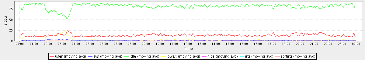avg(user) = 13.24 avg(sys) = 1.39 avg(idle) = 81.93 avg(iowait) = 2.85 avg(nice) = 0.00 avg(irq) = 0.01 avg(softirq) = 0.56