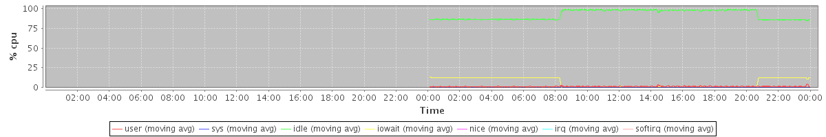 avg(user) = 1.25 avg(sys) = 0.18 avg(idle) = 92.36 avg(iowait) = 6.18 avg(nice) = 0.00 avg(irq) = 0.00 avg(softirq) = 0.00