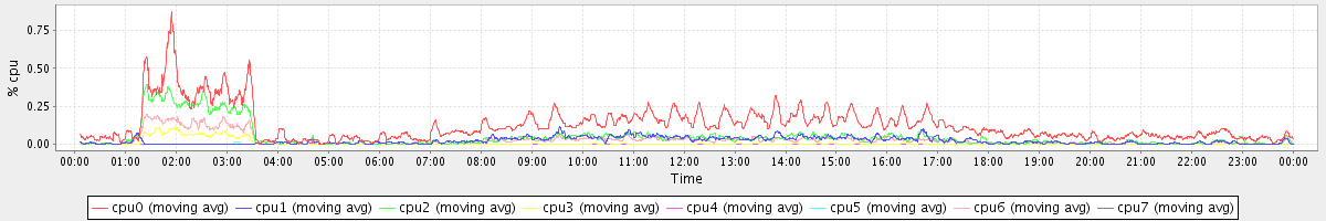 avg(cpu0) = 1.15 avg(cpu1) = 0.25 avg(cpu2) = 0.25 avg(cpu3) = 0.16 avg(cpu4) = 0.13 avg(cpu5) = 0.14 avg(cpu6) = 0.19 avg(cpu7) = 0.15