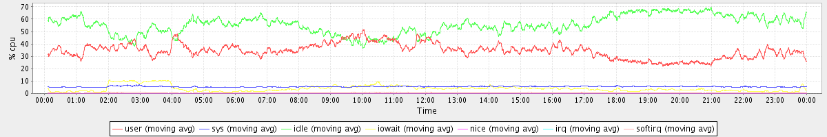 avg(user) = 34.49 avg(sys) = 5.45 avg(idle) = 55.61 avg(iowait) = 3.91 avg(nice) = 0.00 avg(irq) = 0.04 avg(softirq) = 0.50
