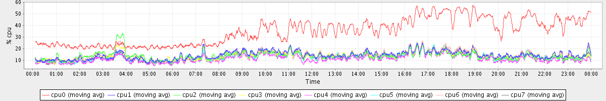 avg(cpu0) = 34.86 avg(cpu1) = 14.35 avg(cpu2) = 13.88 avg(cpu3) = 13.74 avg(cpu4) = 11.39 avg(cpu5) = 12.74 avg(cpu6) = 14.40 avg(cpu7) = 13.01