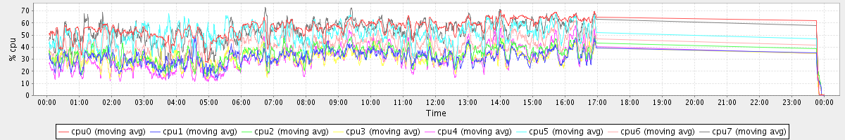 avg(cpu0) = 39.93 avg(cpu1) = 49.49 avg(cpu2) = 38.62 avg(cpu3) = 63.18 avg(cpu4) = 66.49 avg(cpu5) = 46.09 avg(cpu6) = 38.53 avg(cpu7) = 43.78