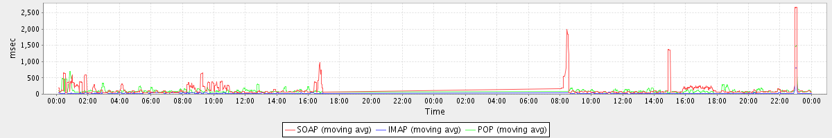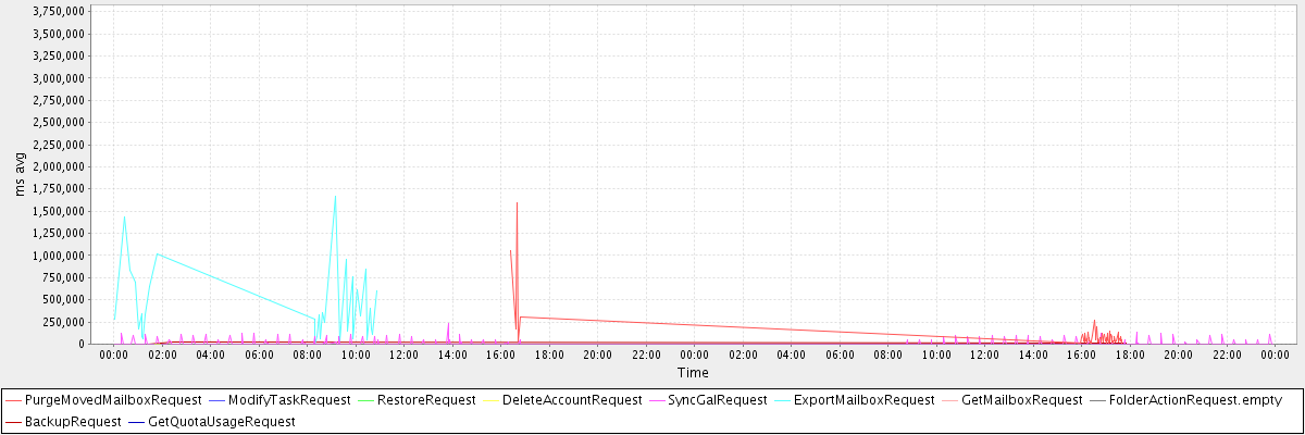 avg(PurgeMovedMailboxRequest) = 104574.38 avg(ModifyTaskRequest) = 1434.00 avg(RestoreRequest) = 3650585.00 avg(DeleteAccountRequest) = 2059.00 avg(SyncGalRequest) = 8562.80 avg(ExportMailboxRequest) = 428347.31 avg(GetMailboxRequest) = 1767.00 avg(FolderActionRequest.empty) = 831.40 avg(BackupRequest) = 12602.00 avg(GetQuotaUsageRequest) = 1097.00