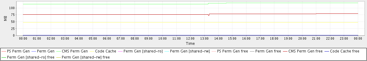 avg(PS Perm Gen) = 0.00 avg(Perm Gen) = 0.00 avg(CMS Perm Gen) = 115.66 avg(Code Cache) = 47.43 avg(Perm Gen [shared-ro]) = 0.00 avg(Perm Gen [shared-rw]) = 0.00 avg(PS Perm Gen free) = 0.00 avg(Perm Gen free) = 0.00 avg(CMS Perm Gen free) = 77.28 avg(Code Cache free) = 0.57 avg(Perm Gen [shared-ro] free) = 0.00 avg(Perm Gen [shared-rw] free) = 0.00